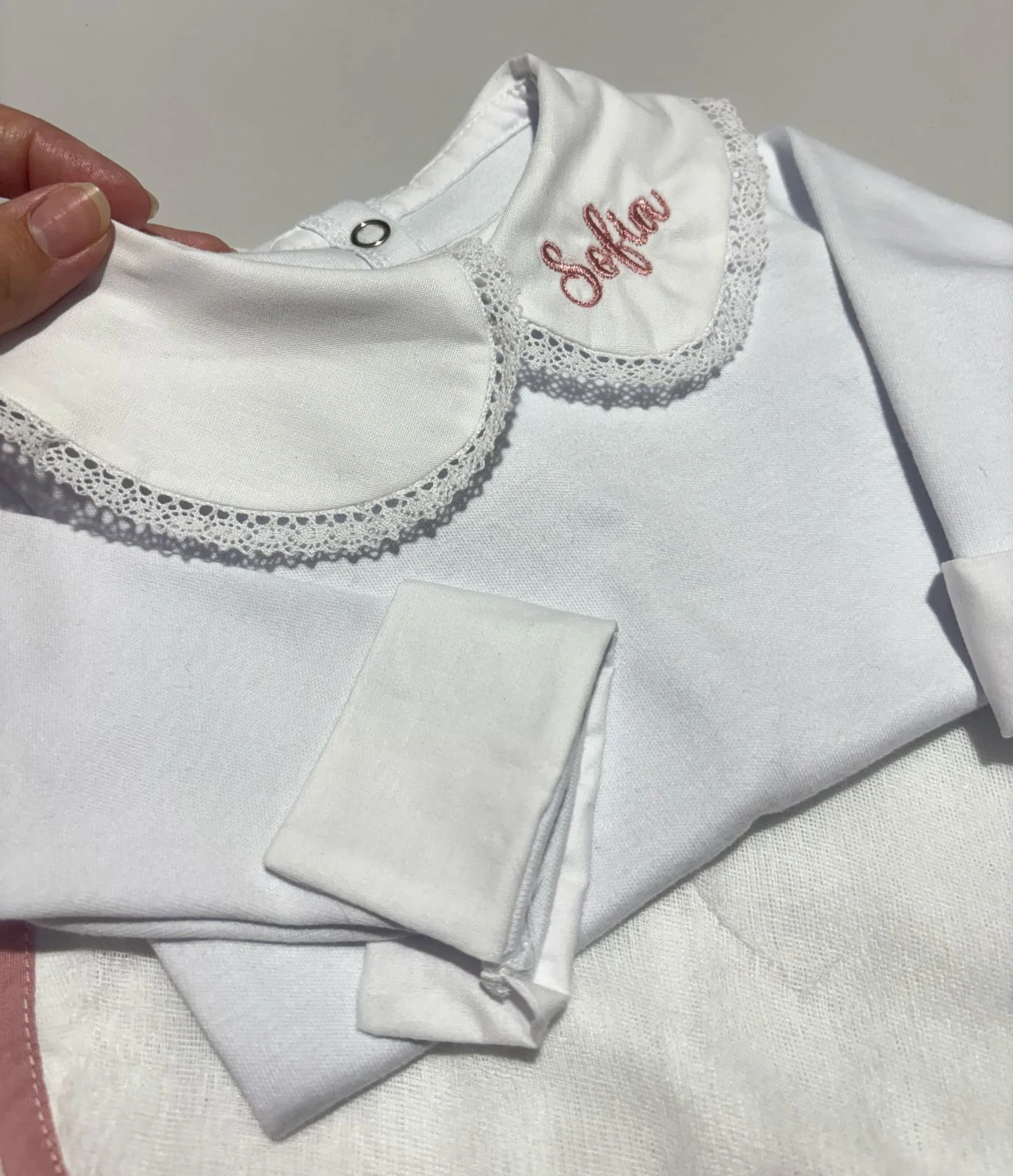 Cada peça é bordada com o nome da criança, trazendo um toque único e cheio de significado. Os detalhes sutis, como acabamentos finos e a escolha cuidadosa das cores, tornam este body ideal para ocasiões especiais ou para o dia a dia com muito charme.
